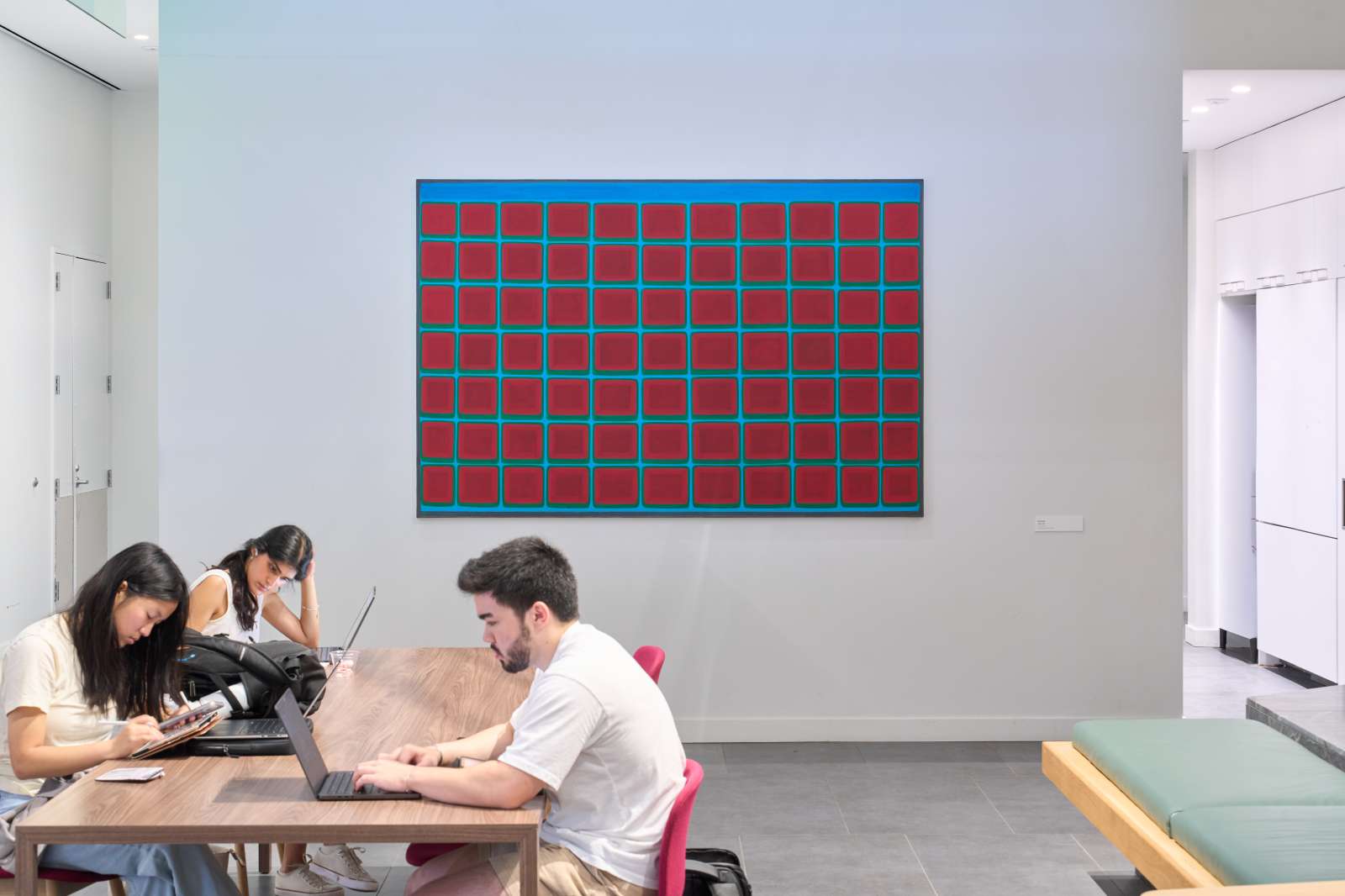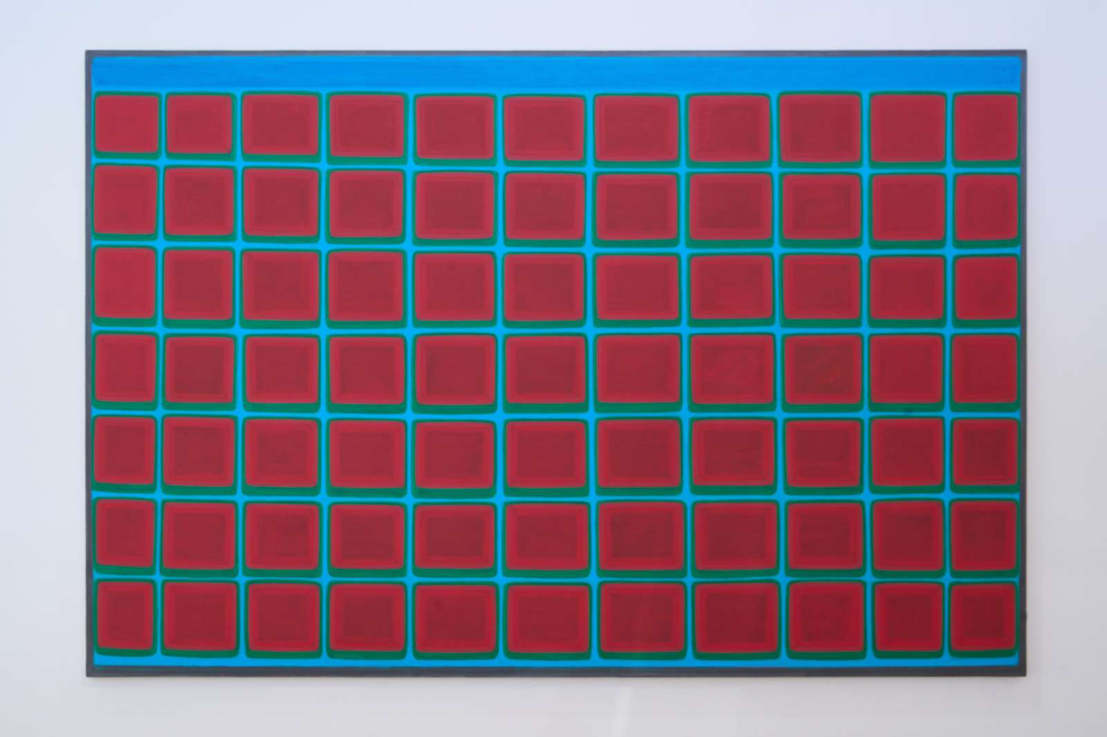 In Prop, the repetition of red and pink squares contained within a blue grid floating on a halo of green reveals a playful architectonic sensibility that treats color as structure. Irregular concentric blue bands outline the squares, generating an optical illusion that makes them appear to radiate with energy. Borrowing stylistic tropes from Optical Art—such as rhythmic and repeating patterns—Prop invites perceptual shifts when observed from various angles. This effect is influenced by Walsh’s interest in the meditative qualities of Tibetan mandalas, whose entrancing forms can appear to pulsate.