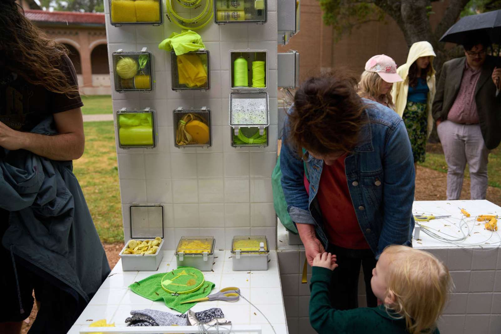 The materials and tools affixed to the rectangular structure are predominantly yellow in color to attract and alert visitors to their presence. The surface tiles, chosen for their practical maintenance and weather resistance, are reminiscent of public spaces, especially areas of transit such as subway stations. Repair Station is equipped with useful items, including scissors, needles, tape, and buttons, as well as visual and audio instructions that are accessible via QR codes. These videos include excerpts from the oral archive that Gartrell has assembled of Southern craftspeople offering insight into traditions of making and restoring, especially in the context of Appalachian craft and culture.