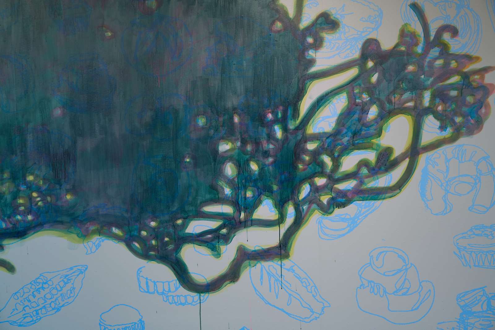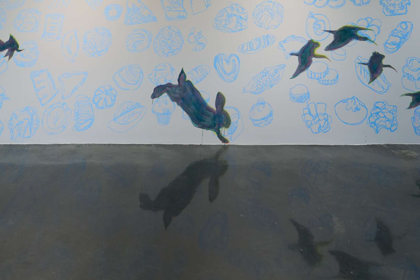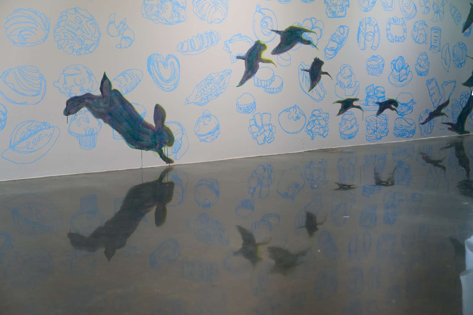 Cafeteria was inspired by Jiang’s frequent visits to the Brochstein Pavilion while she audited philosophy classes at Rice University during her two-year Core Residency Program at the Glassell School of Art at the Museum of Fine Arts, Houston. To create this work, Jiang drew from Houston’s culinary histories, illustrating pastries—including those sold in the café here—through an expressive, freehand approach. Overlaid with acrylic paint, the mural depicts the silhouettes of windswept oak trees, birds in flight, and passing students, their shadows mirroring the world outside. In this space where contemplation and leisure intersect, Jiang’s Cafeteria raises questions about what we know, what reality is, and where it begins to slip into a dream.